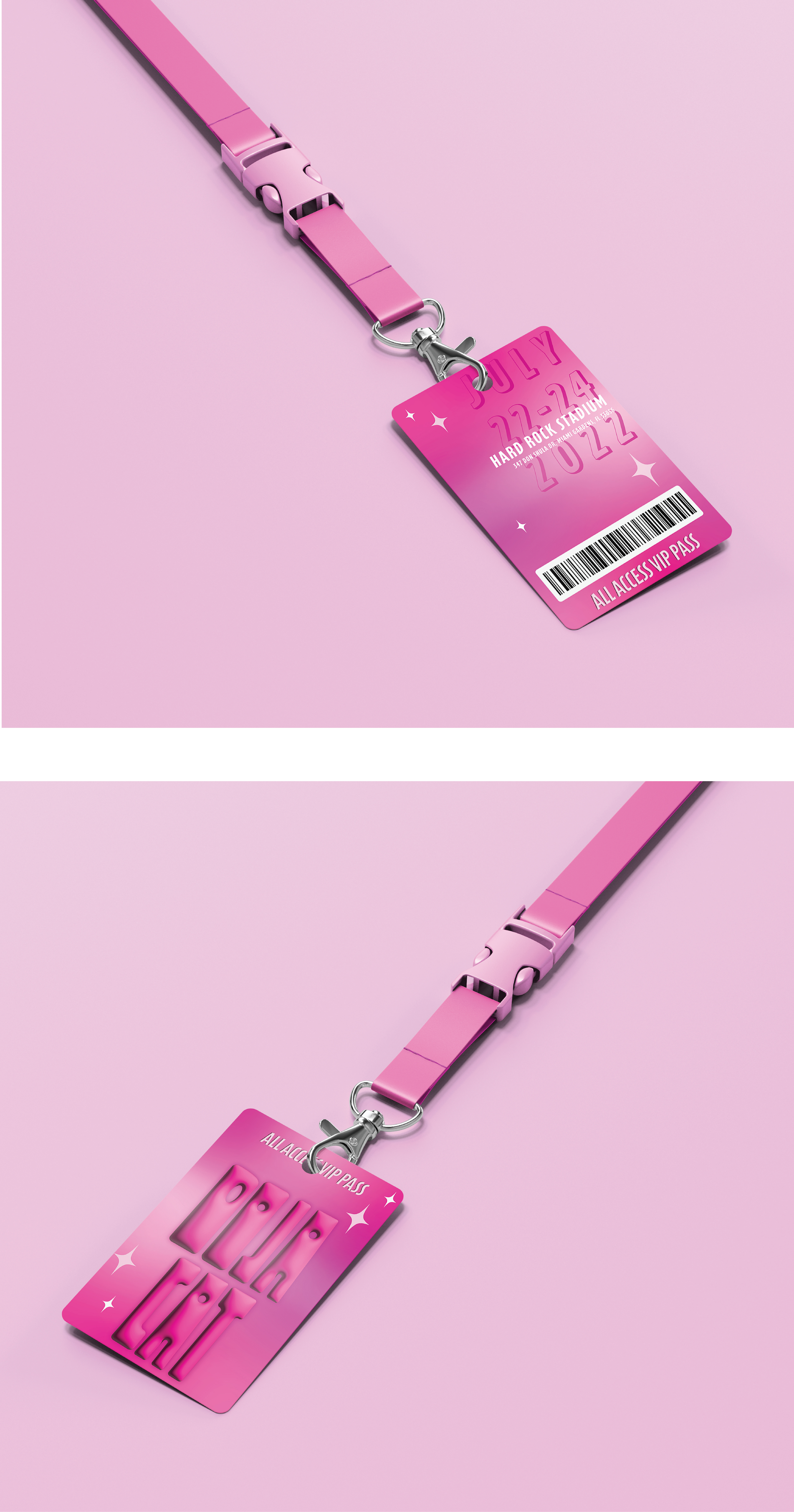 Doja Cat is an award winning artist, so I made a promotional concert poster, along with a VIP pass and a button pin. Shades of pink are used almost exclusively throughout these pieces to embody the artist’s personal aesthetic.